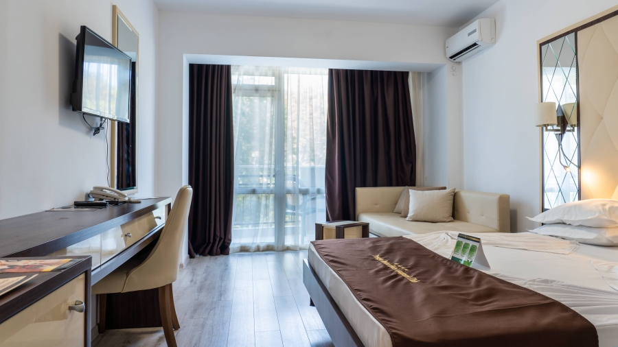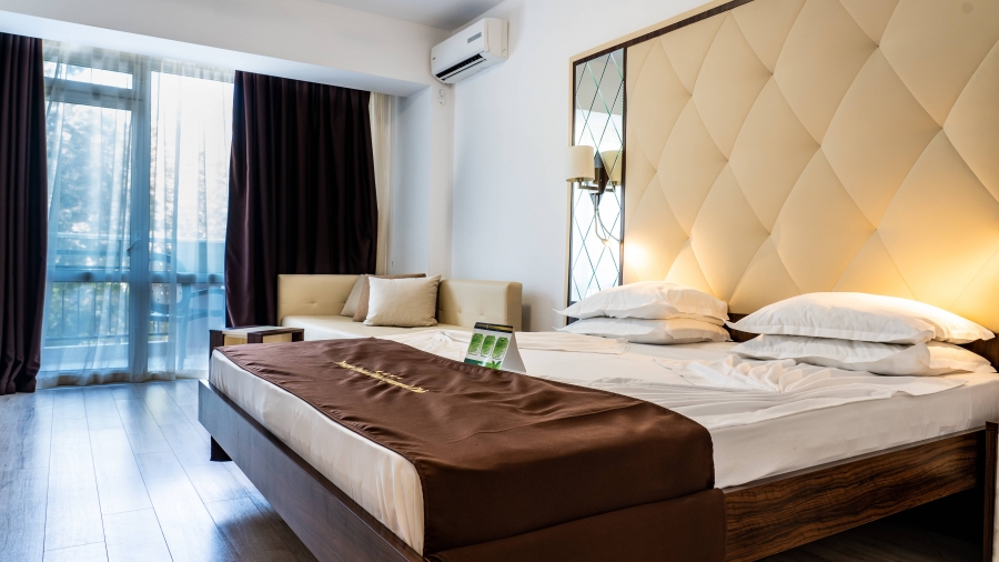 Camera Double Deluxe are un dormitor cu pat dublu, zonă de relaxare, baie privată și balcon cu mobilier de exterior. Camera este dotată cu aer condiționat, seif, mini-frigider, ceainic electric, internet, TV cu canale prin satelit, duș și/sau cadă în baie, uscător de păr și articole de toaletă.